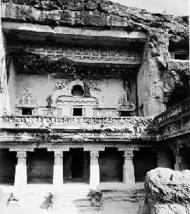 印度中世纪佛教、印度教、耆那教石窟群。埃洛拉在今马哈拉施特拉邦的重镇奥兰加巴德西北约25公里,自古是佛教、印度教、耆那教三教朝拜的圣地。7~10世纪,即早期遮卢迦王朝(约500~753)、特别是拉什特拉库塔王朝(约753~949)统治德干地区期间,在埃洛拉一座南北走向的新月形火成岩山麓陡坡上,陆续开凿了34座石窟,全长约2公里。考古学家把这34座石窟从南