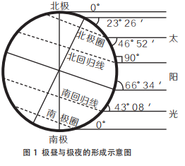 简单地说,是由于地球在围绕太阳公转的同时绕着自身的地轴(地轴是倾斜的)旋转而造成的。地球在自转时,地轴有一个23.5°的倾角,因此,地球在公转时便出现了这样一种情况:有6个月时间,南北两极之中总有一极朝着太阳,全是白天;另一极背向太阳,全是黑夜(图1)。