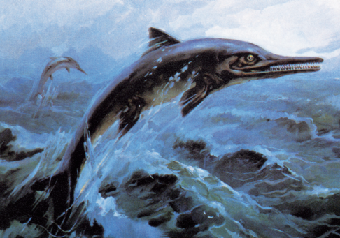中生代时,恐龙统治了陆地。但有一些爬行动物生活在海里,它们有一个共同的名字叫“海洋爬行动物”,又被称为“中生代的海怪”。比如大家熟悉的鱼龙、蛇颈龙和沧龙,以及不太熟悉的齿龙、海龙等。它们的名字里大都有一个“龙”字,但都不是恐龙。虽然有个别恐龙可以在水中游泳捕食(比如棘龙),但恐龙主要生活在陆地上;还有一些恐龙能飞上蓝天,比如小盗龙、近鸟龙、足羽龙等。恐龙与“海怪”们的联系是,它们同属于双孔类爬行动物,只不过这个亲缘关系不如翼龙和恐龙的亲缘关系近,更不如鸟类和恐龙的亲缘关系近。