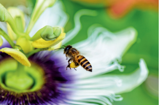 每逢花期时分的上午9点左右,刚刚绽放的西番莲花高高举起3根柱头,远远高出5枚雄蕊。中午过后,花朵完全开放,3根柱头逐渐下垂,穿过5枚雄蕊的缝隙。在副花冠的导引下,蜜蜂等昆虫准确地降落,沿着紫色蜜腺环找到蜜室入口,毫不犹豫地用口器戳破盖子,插入蜜室吸食花蜜。进餐过程中,被昆虫背来的花粉悄无声息地沾在了花朵的柱头上。花柱一旦授粉,雄蕊的花药立即开裂,“花粉雨”又一次洒落在昆虫背上,被毫不知情的它们背走。下次昆虫就餐时,西番莲便借机完成了异花传粉任务。