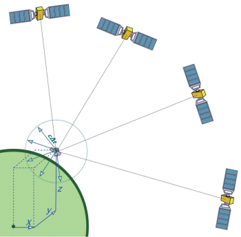 用户只需要解出四个参数:在地球上的三维坐标x,y,z和钟差t(毕竟用户的石英钟不可能和原子钟精度相比,需要把它的误差作为一个未知数解出来)。用户只需接收到4颗卫星信号,通过构建4个方程,解出4个未知数,即可精确确定自身的位置和时间。