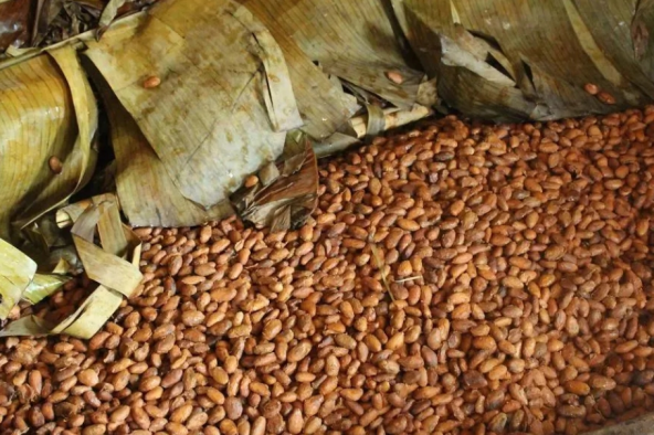 可可果实成熟采收后,需要堆在地上或者篮子里进行后熟,让果肉液化,没有这个步骤可可豆的味道会和生土豆差不多。之后就要把可可豆剥离出来发酵10天左右。在发酵过程中可可豆产生了复杂的生物化学变化,糖分会逐渐分解产生酵素和酸,使豆粒组织变得疏松,苦涩味减弱,香味增加,出现可可的特有香味。这一步对于巧克力风味的形成至关重要,巧克力品质的好坏和发酵的程度也有很大的关系。