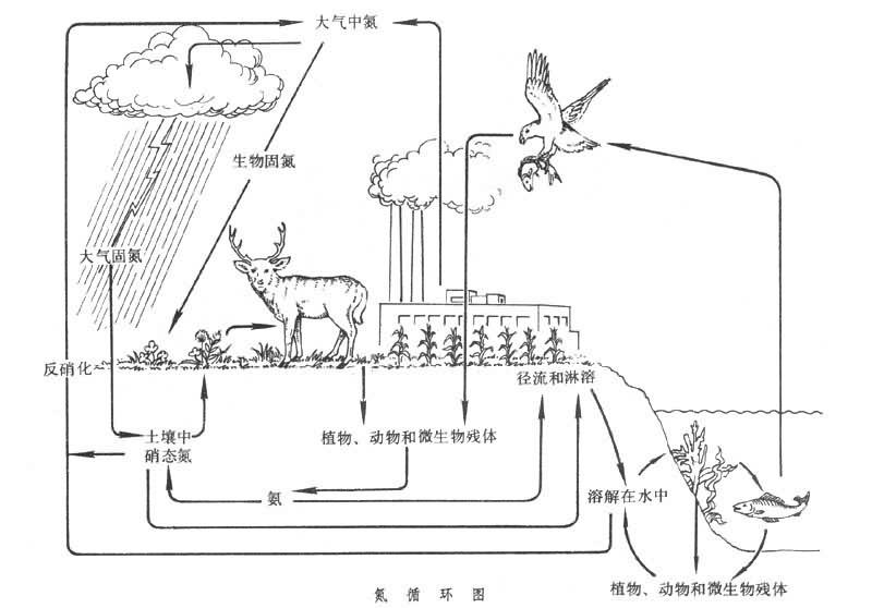 大气中的氮经由生物引起的一些复杂的转化反应,能被动植物所利用,进而维持动植物的生命。